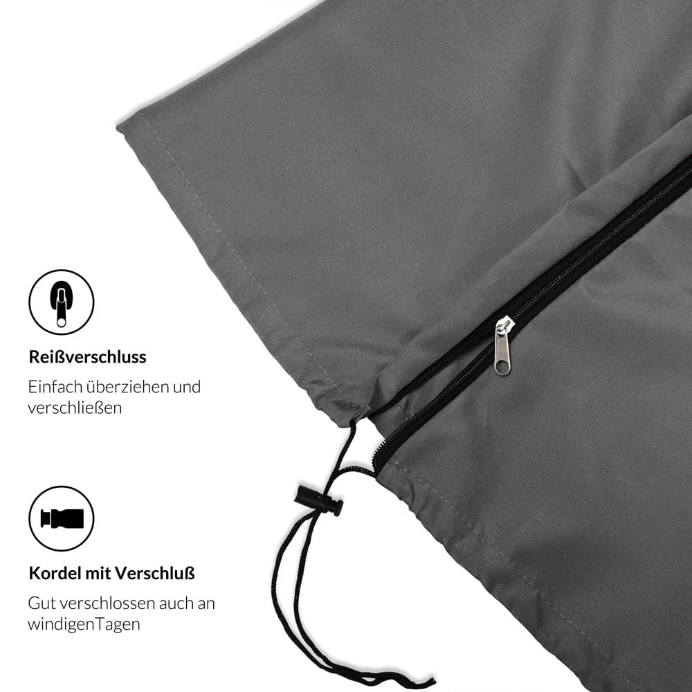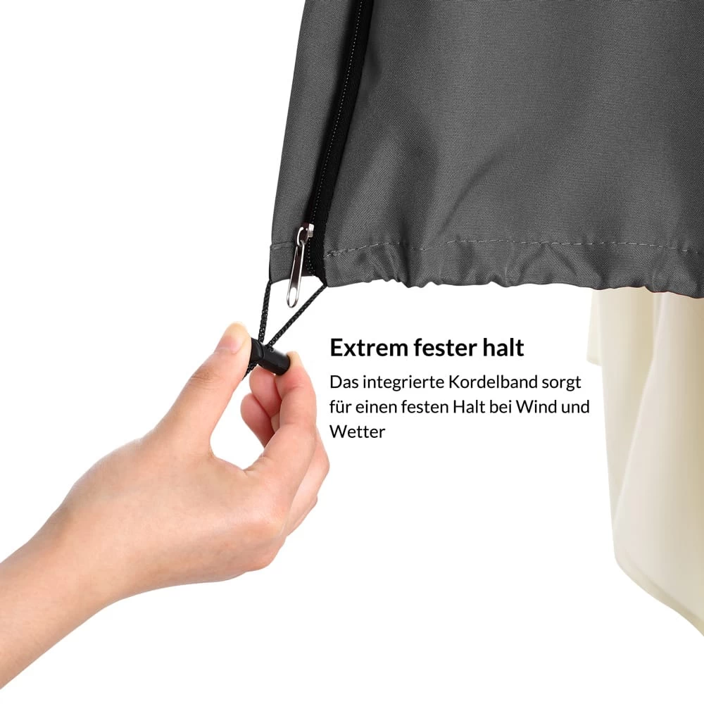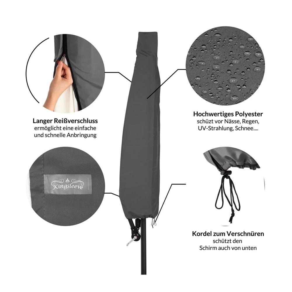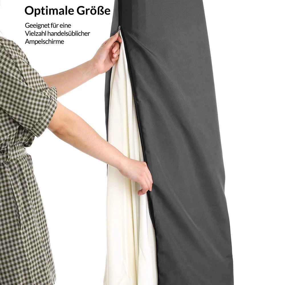 Die Schutzhülle mit Reißverschluss aus 160 g/m² Polyester bewahrt Ihren Sonnenschirm vor Feuchtigkeit, Schmutz, Frost und Staub.
