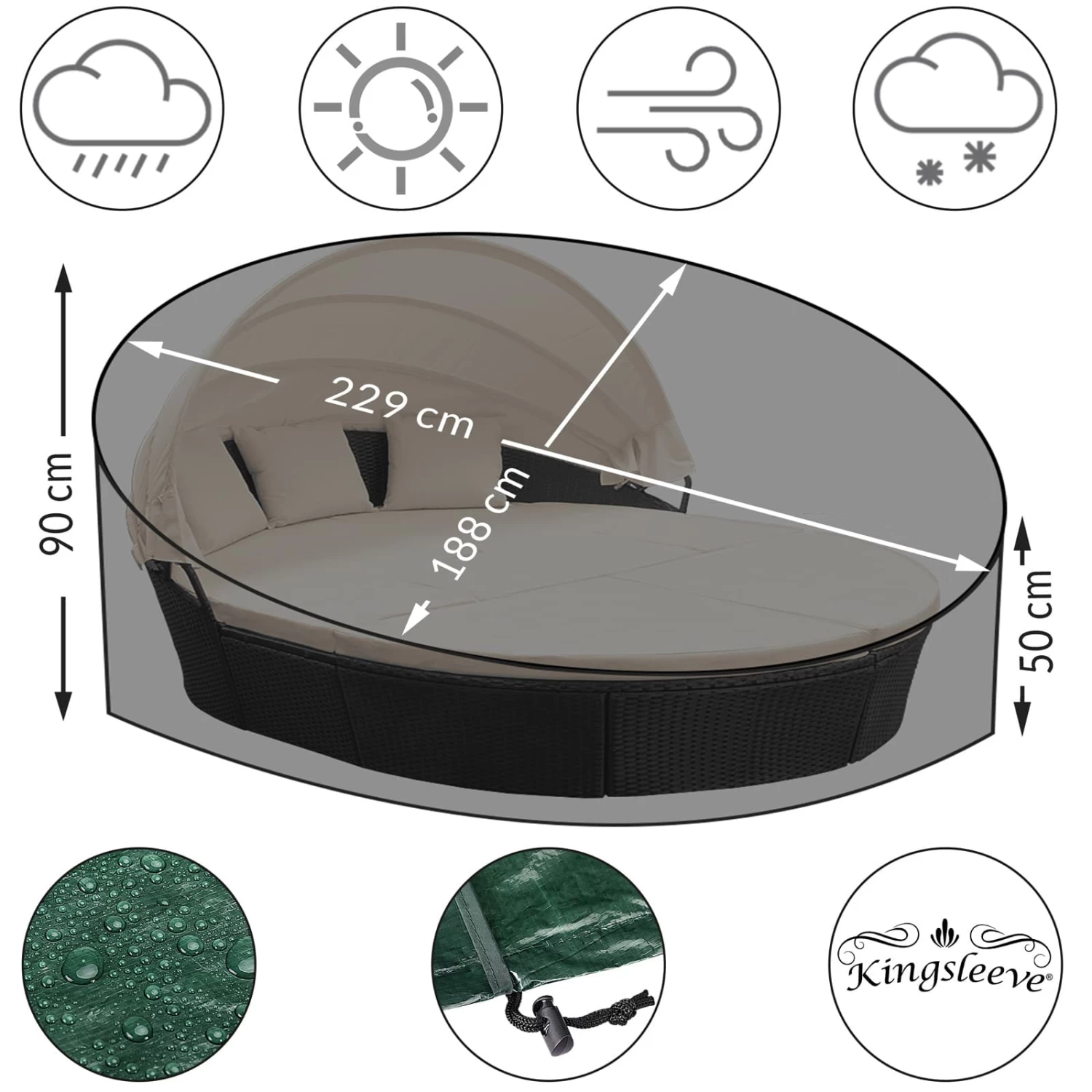 - Maße (LxBxH): 229 x 188 x 90-50 cm – oval