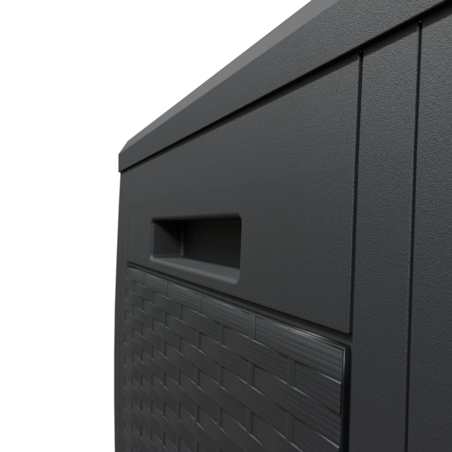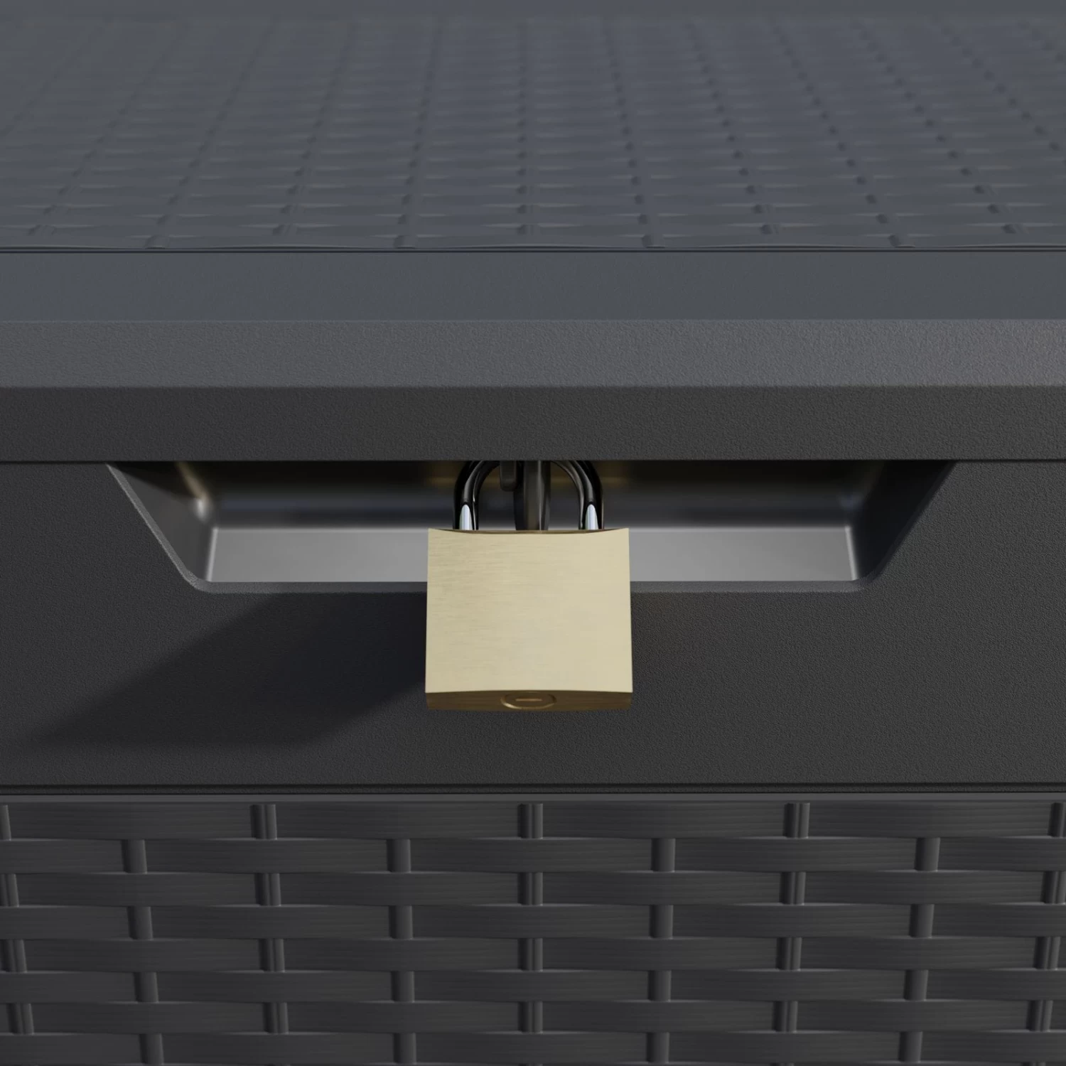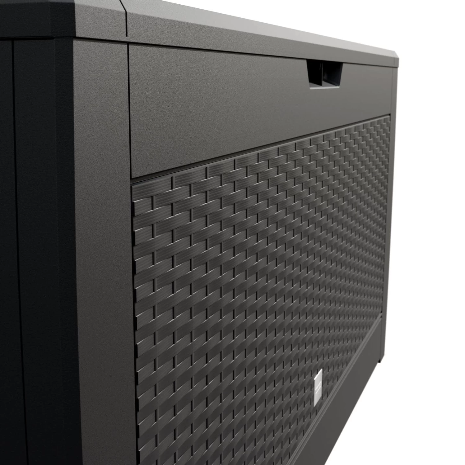 Diese Aufbewahrungsbox in Rattanoptik ist der ideale Aufbewahrungsort für Sitzauflagen, Kissen und andere Gartenaccessoires.