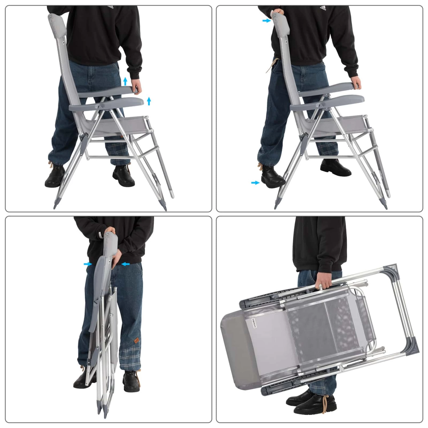 Die Hochlehner sind 7-fach verstellbar und bestehen aus einem hochwertigen Aluminiumrahmen. Der Kopfbereich ist mit einem bequemen Polster ausgestattet.