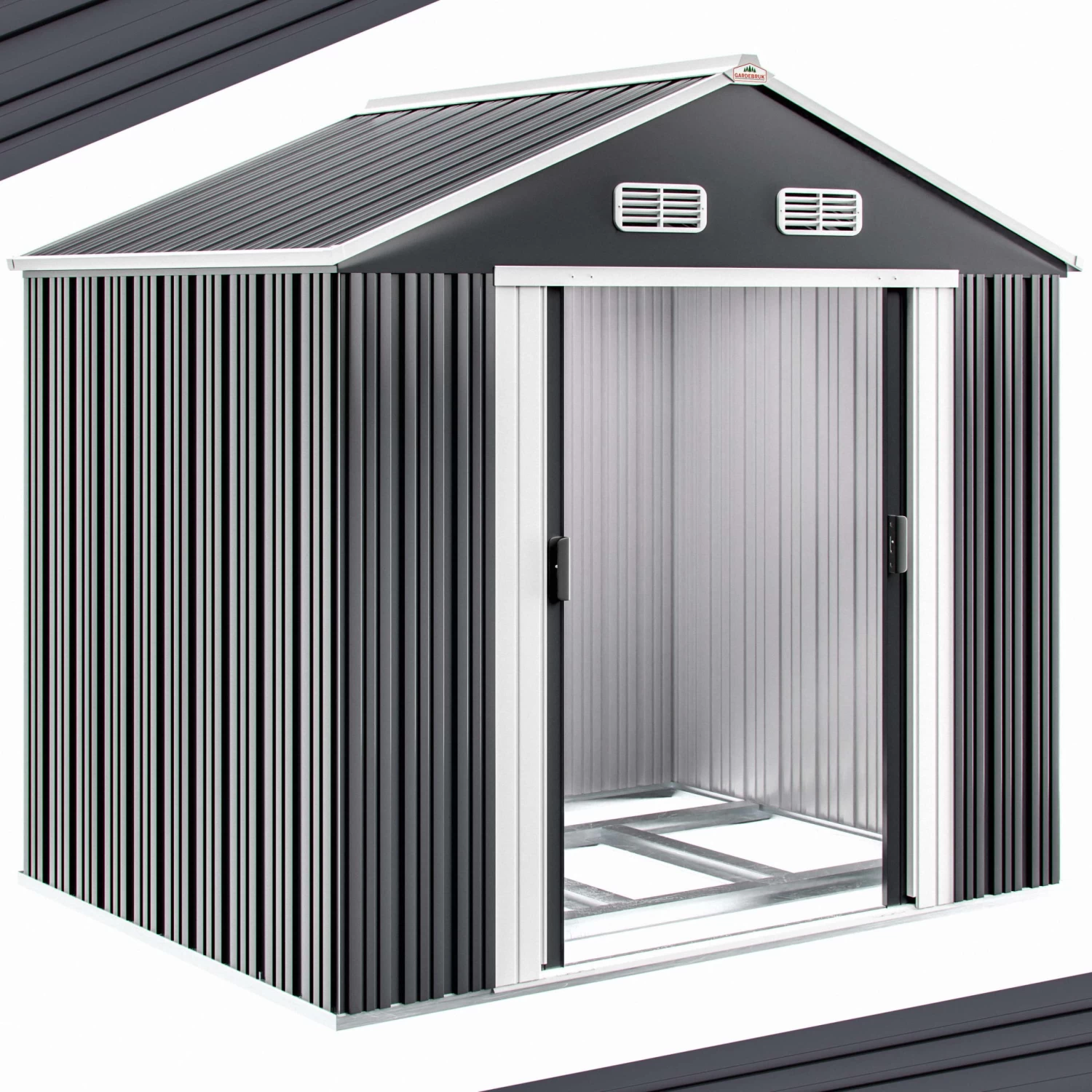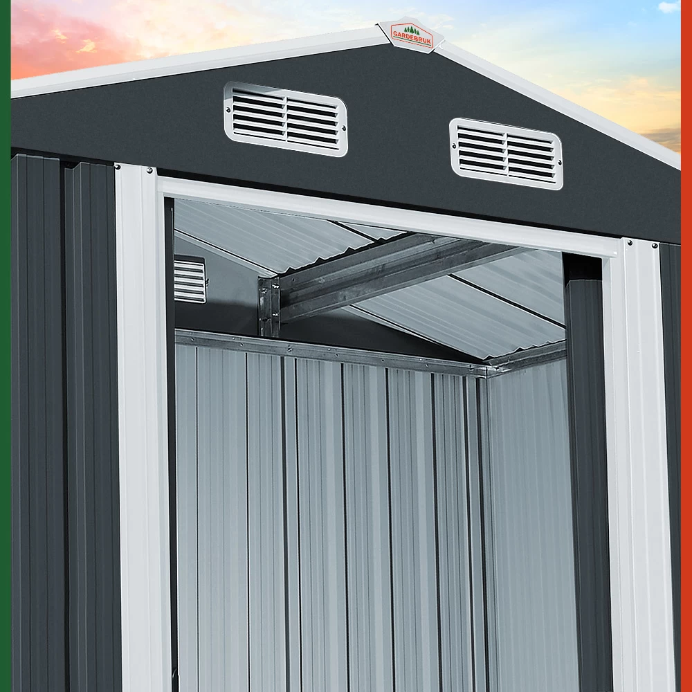In diesem Gerätehaus sind Ihre Gartengeräte sicher verstaut. Der verzinkte Bodenkranz ermöglicht zudem die Montage eines Holzbodens (dieser ist nicht im Lieferumfang enthalten).Das Gartenhaus bietet Platz für Fahrräder, Werkzeuge und andere Gartenutensilien. Es besitzt außerdem eine zweigeteilte Schiebetür, 4 Belüftungsöffnungen an der Oberseite (jeweils 2 x vorne und hinten) und wird inklusive Bodenleiste geliefert.