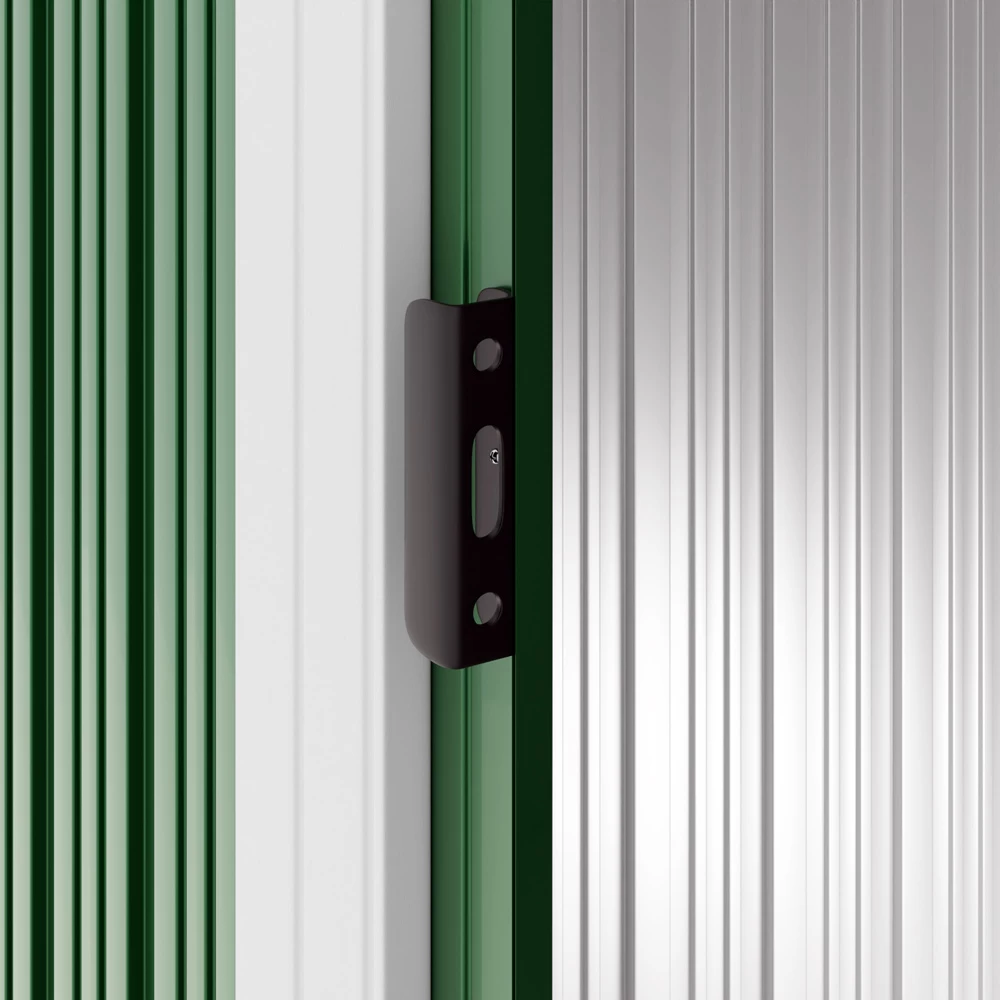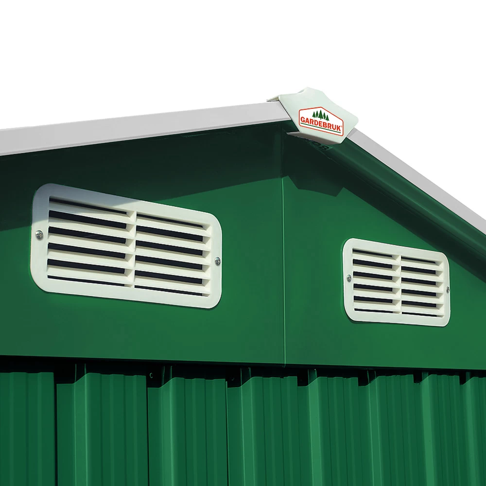 In diesem Gerätehaus sind Ihre Gartengeräte sicher verstaut. Der verzinkte Bodenkranz ermöglicht zudem die Montage eines Holzbodens (dieser ist nicht im Lieferumfang enthalten).Das Gartenhaus bietet Platz für Fahrräder, Werkzeuge und andere Gartenutensilien. Es besitzt außerdem eine zweigeteilte Schiebetür, 4 Belüftungsöffnungen an der Oberseite (jeweils 2 x vorne und hinten) und wird inklusive Bodenleiste geliefert.