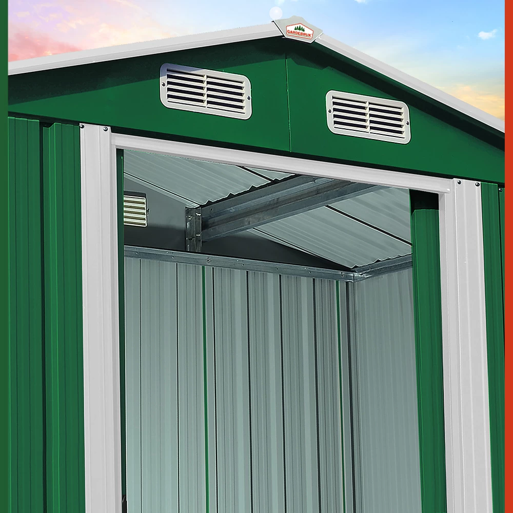 In diesem Gerätehaus sind Ihre Gartengeräte sicher verstaut. Der verzinkte Bodenkranz ermöglicht zudem die Montage eines Holzbodens (dieser ist nicht im Lieferumfang enthalten).Das Gartenhaus bietet Platz für Fahrräder, Werkzeuge und andere Gartenutensilien. Es besitzt außerdem eine zweigeteilte Schiebetür, 4 Belüftungsöffnungen an der Oberseite (jeweils 2 x vorne und hinten) und wird inklusive Bodenleiste geliefert.