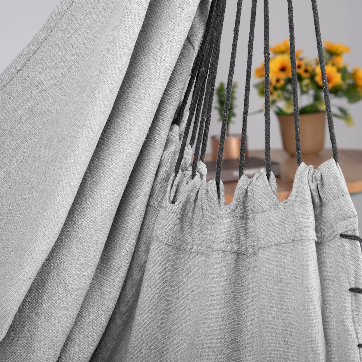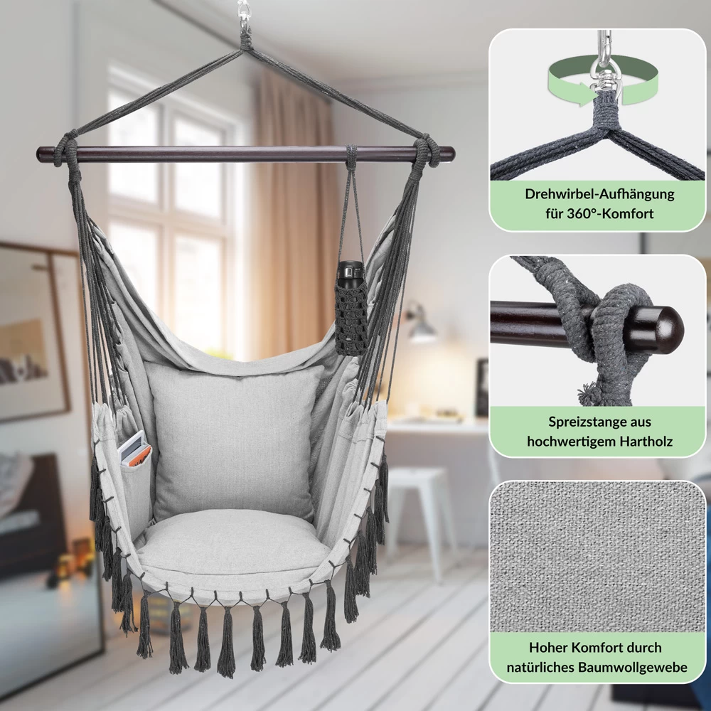 Mit der 360° Komfort-Drehwirbel-Aufhängung an einem massiven Stahl-Haken kann der Hängesessel individuell ausgerichtet und in alle Richtungen geschaukelt werden.