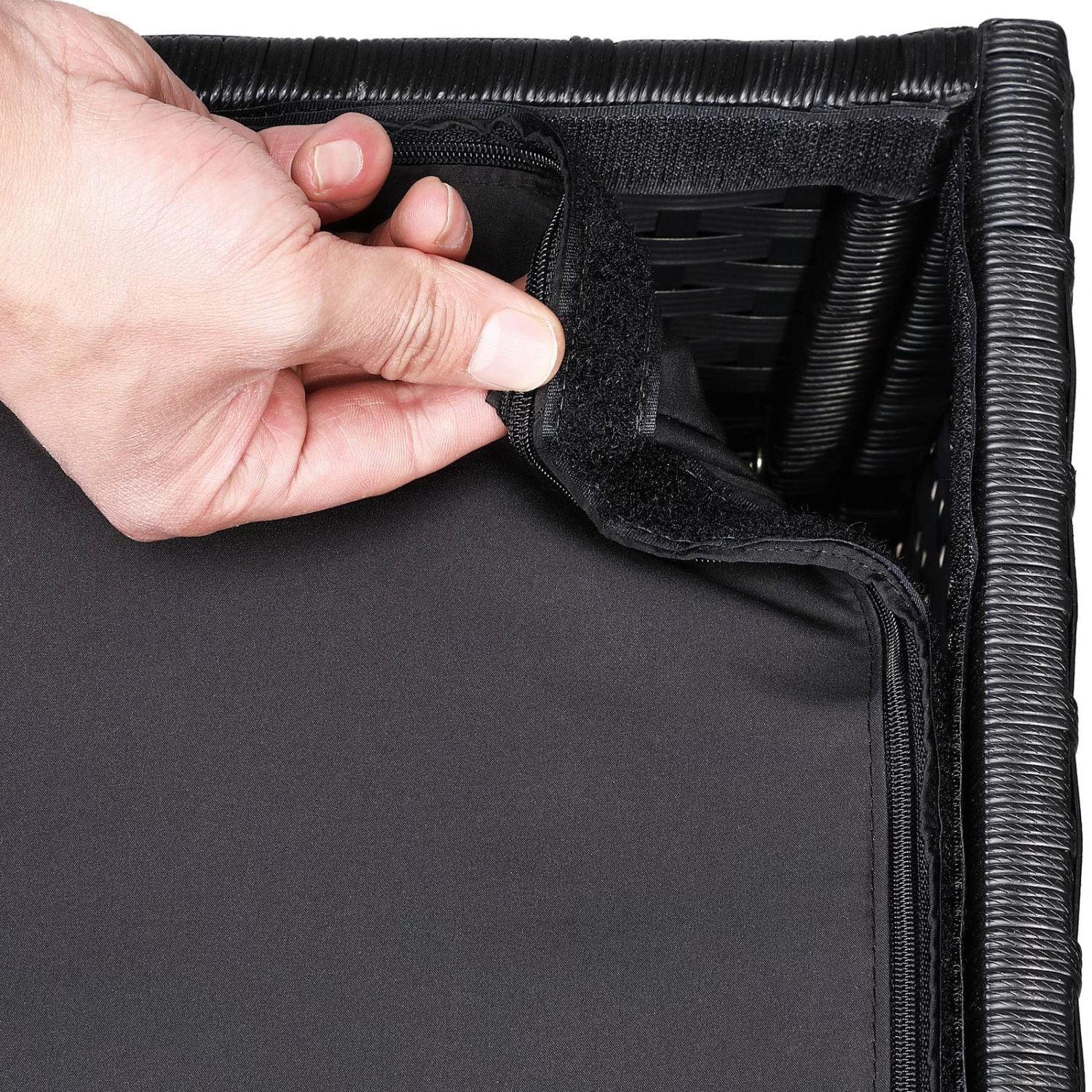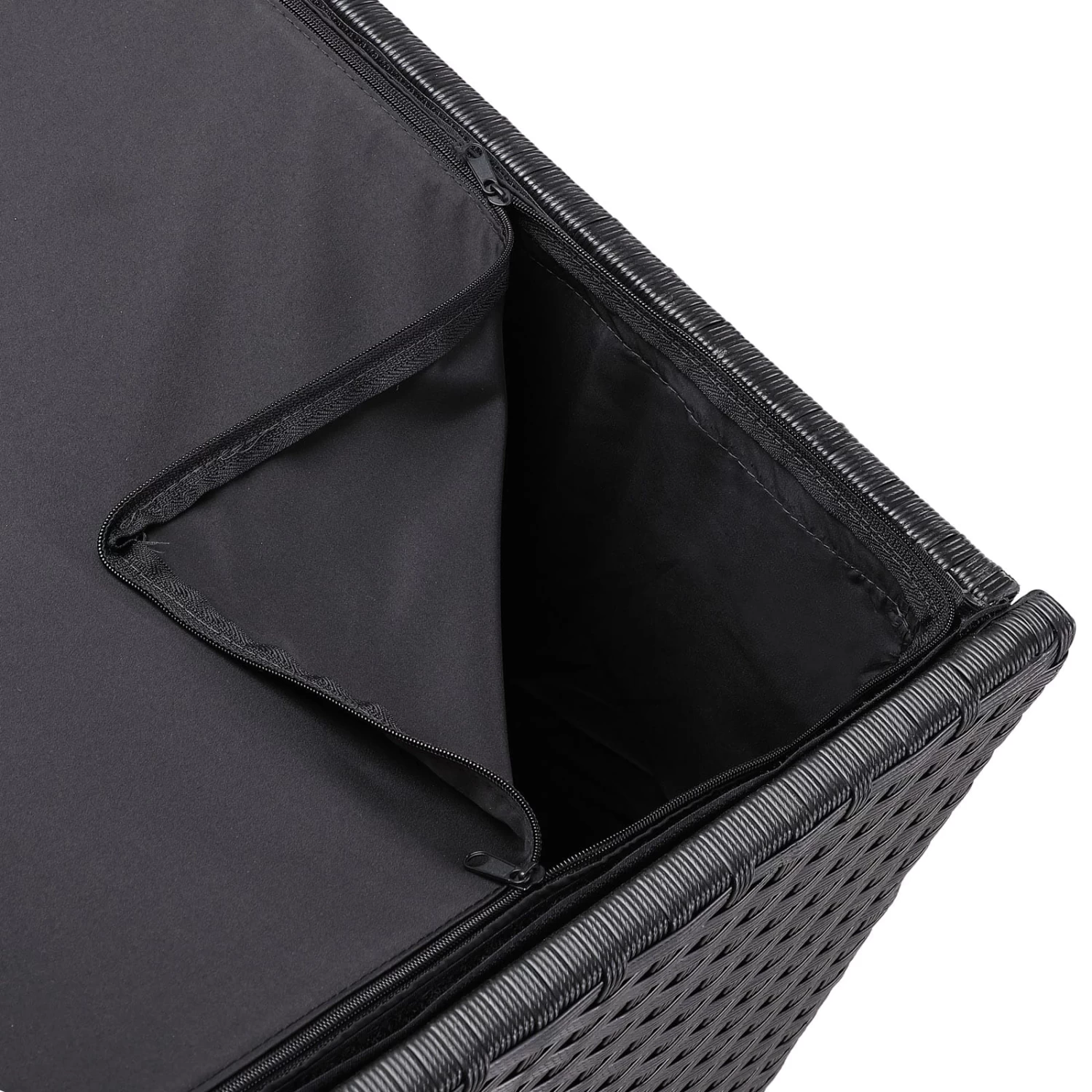 Eine vollumlaufende, mit Klett befestigte Innenverkleidung aus Polyester mit wasserdichter Beschichtung sowie ein Reißverschluss mit großer Öffnung, schützen Ihre Auflagen ideal gegen Feuchtigkeit und Insekten.
