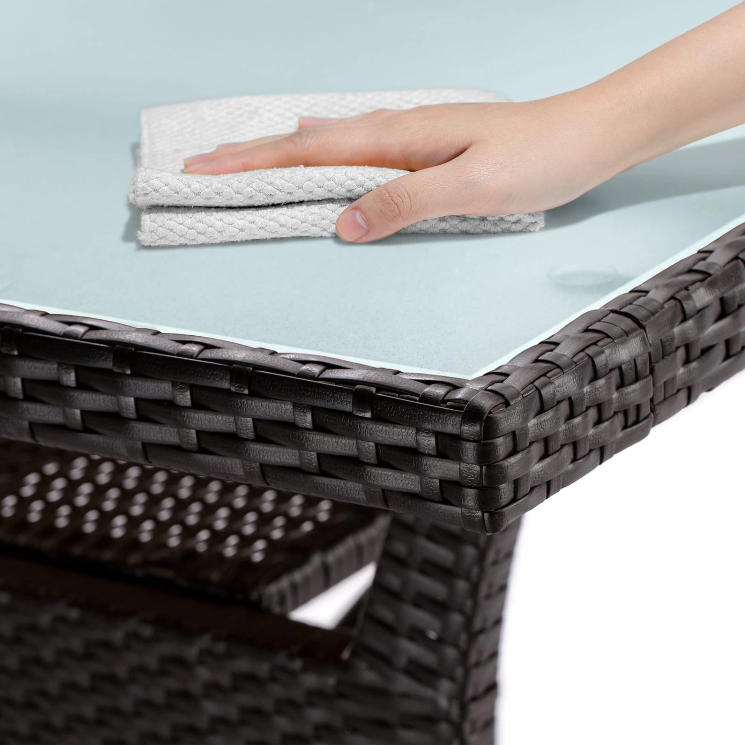 Das pulverbeschichtete Stahlgestell des Tisches und die zusätzlich angebrachten Querstreben hält auch starken Beanspruchungen stand. Das hochwertige Rattan ist wetterfest, UV-lichtbeständig und einfach zu reinigen.