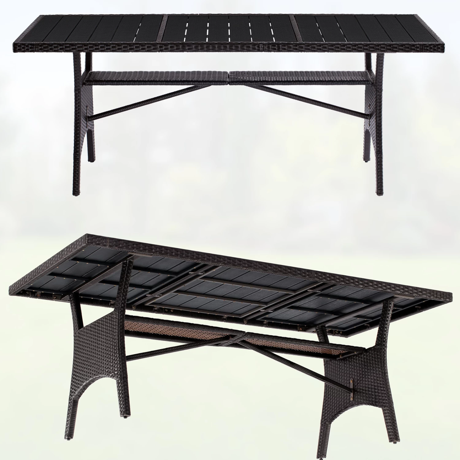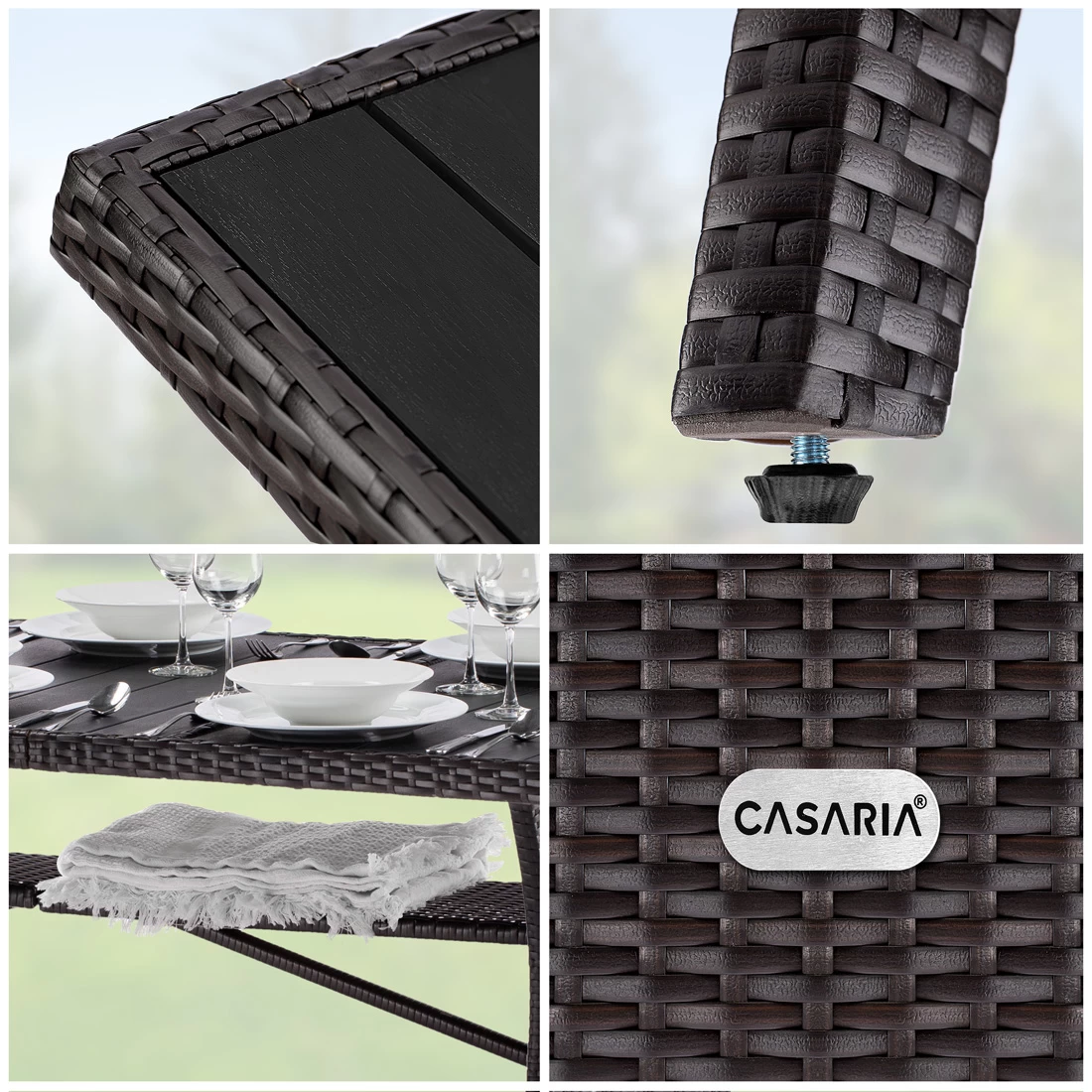 - Material Tischplatte: WPC (Holz/Kunststoffkombination)