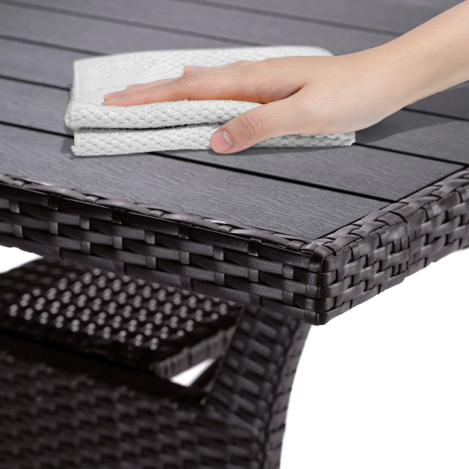 Dieser exklusive Polyrattan Gartentisch ist mit einer sehr robusten und widerstandsfähigen Tischplatte aus WPC in Holzoptik ausgestattet. Dadurch ist der Tisch vor Wind und Wetter gut geschützt und ideal für den Garten, die Terrasse oder im Haus geeignet.