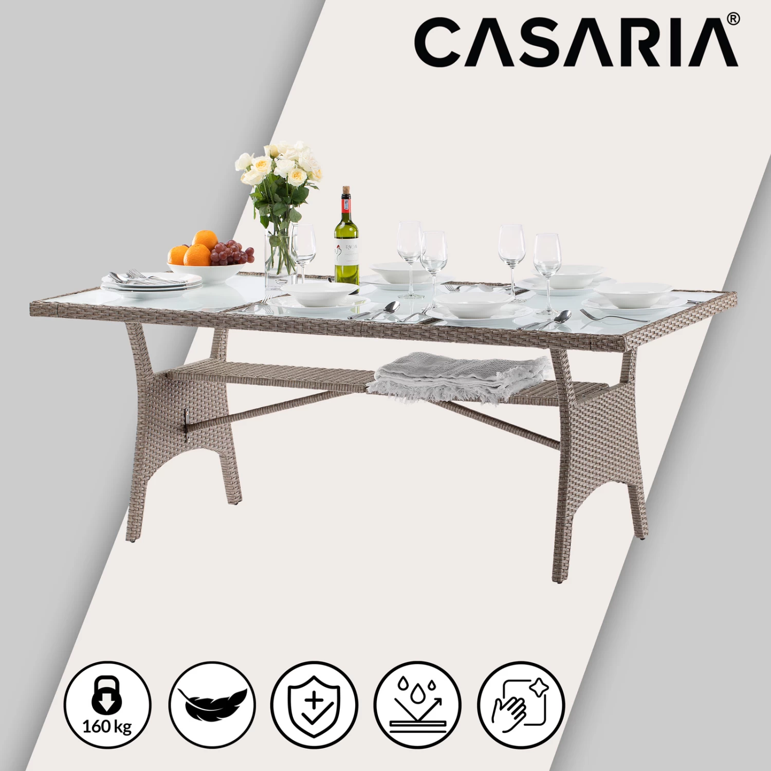 Der große Gartentisch von Casaria® ist das Highlight für Ihr Garten, Terrasse oder Wintergarten. An der großen Milchglasplatte finden bis zu 8 Personen Platz. Damit kann die nächste Grillparty starten!