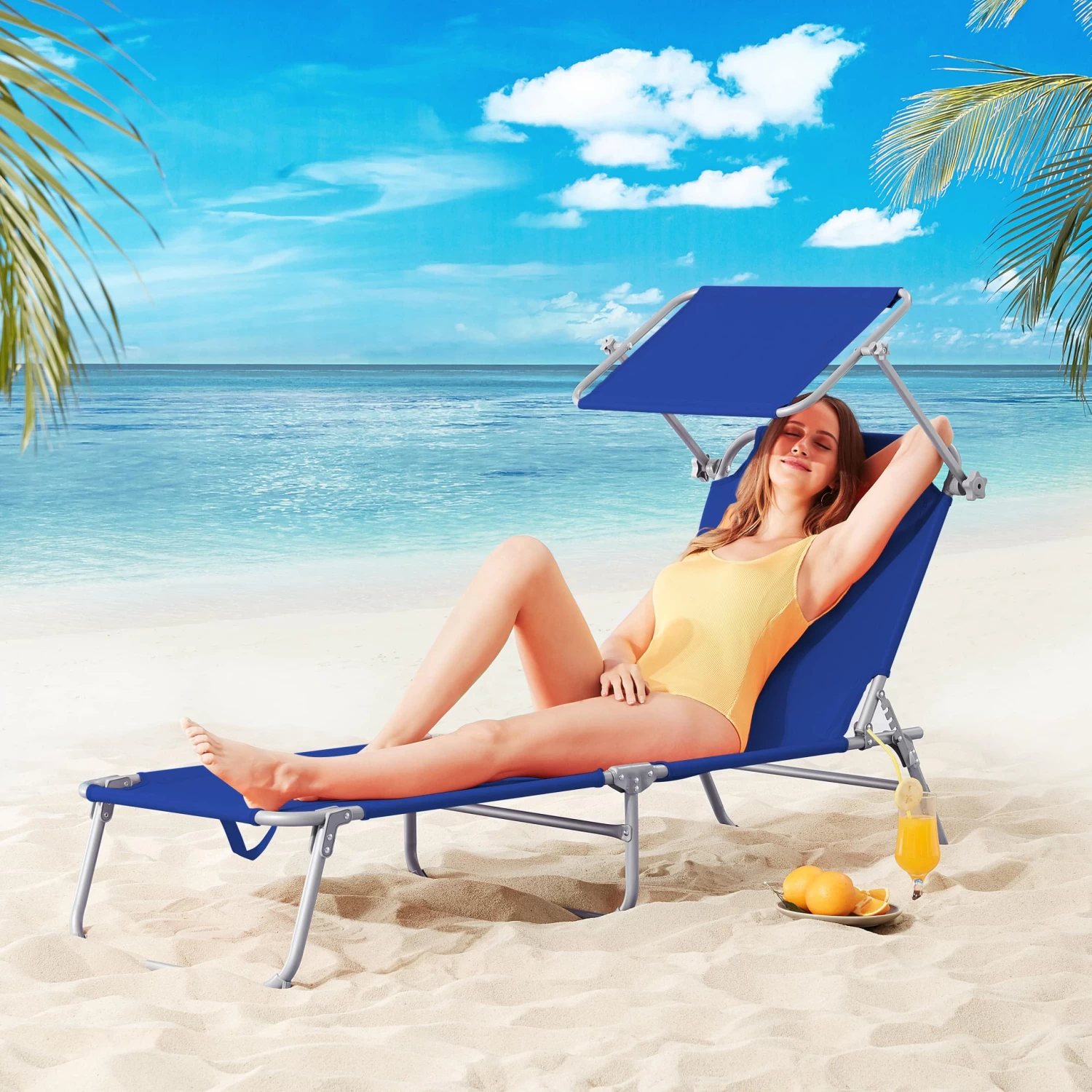 Die Liege mit Sonnendach hat eine 4-fach verstellbare Rückenlehne und einen einstellbaren Sonnenschutz für den Kopfbereich, damit Sie die Sonnenstrahlen in angenehmer Position genießen können.