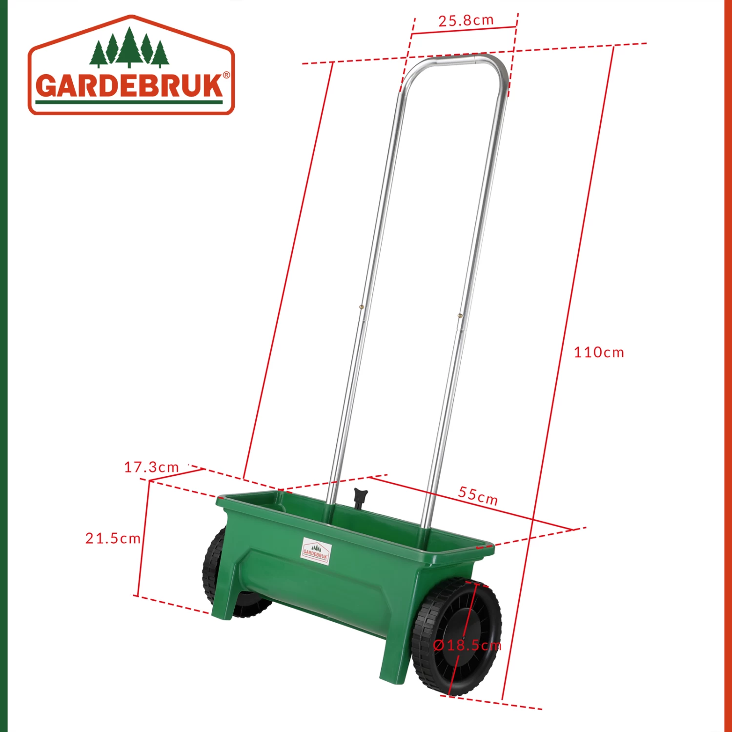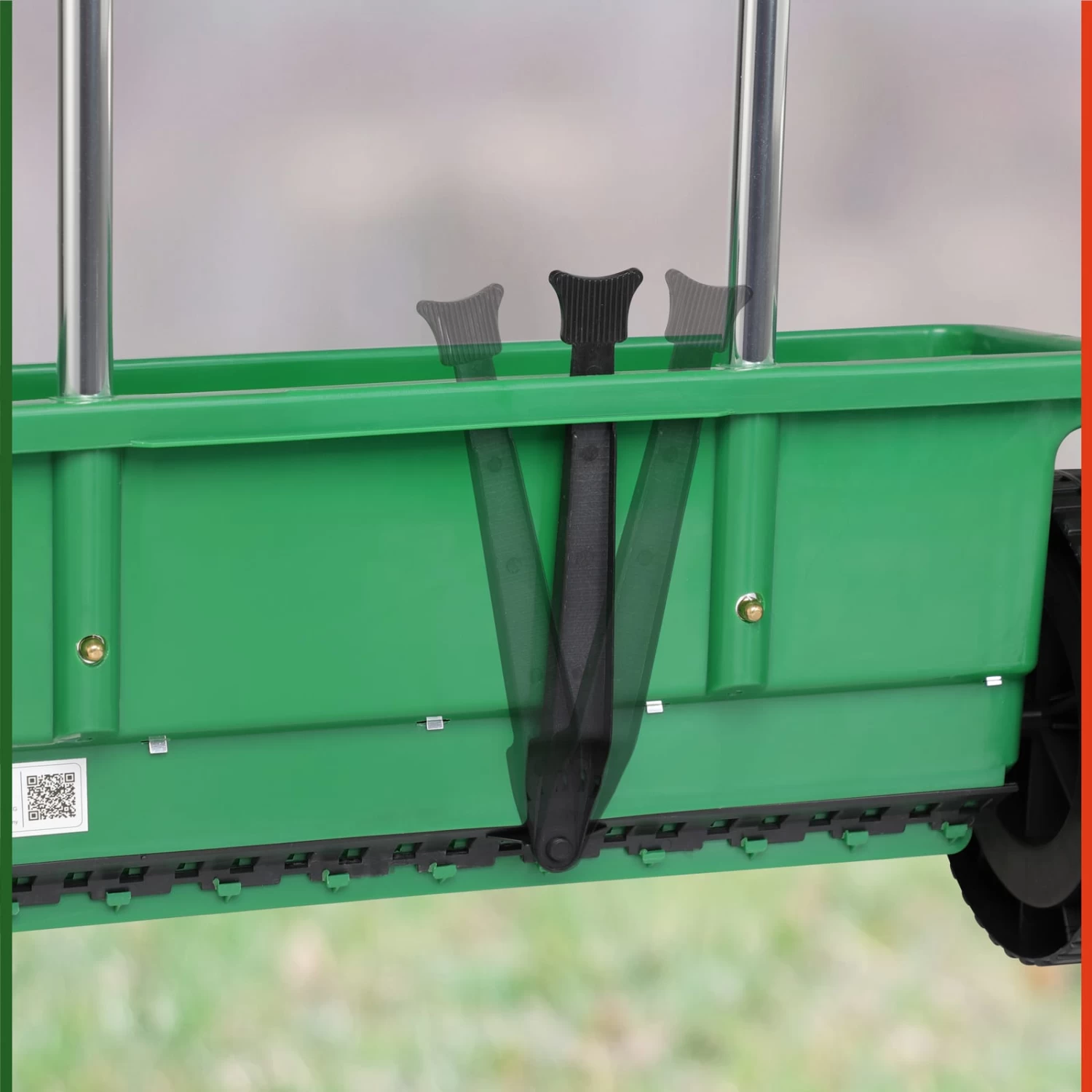 Das Gehäuse des Gartenstreuwagens besteht aus hochwertigem, bruchfestem Kunststoff und verfügt über eine korrosionsfeste, witterungsbeständige Walze.